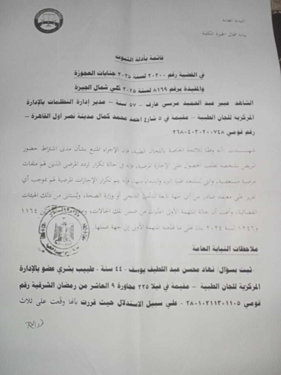 في سياق التحقيقات، استمعت النيابة العامة إلى شهادة عبير عبد الحميد مرسي عارف، مدير إدارة التظلمات بالإدارة المركزية للجان الطبية.