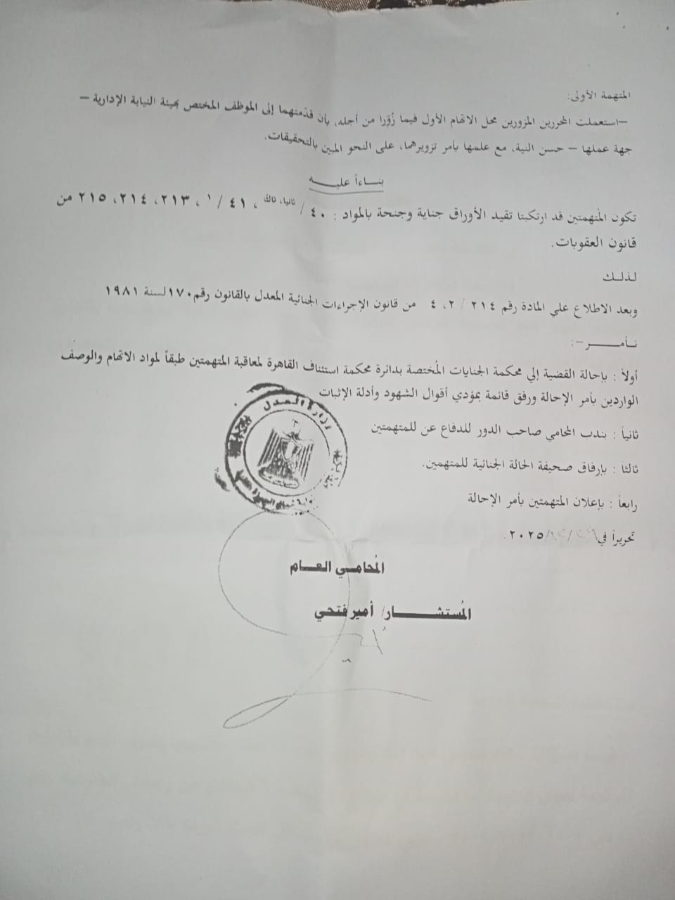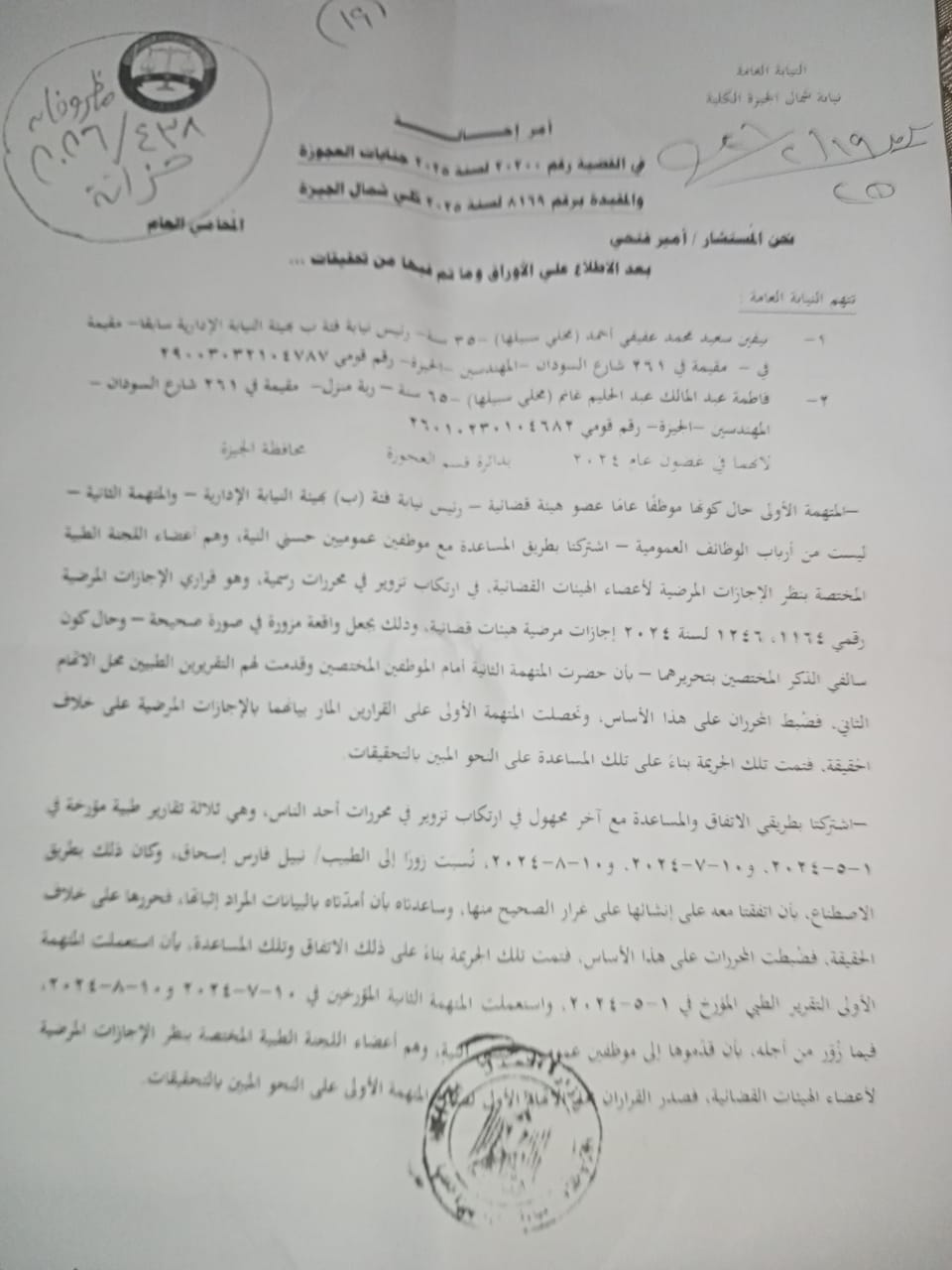 حصل "الرئيس نيوز" على نص أمر الإحالة الصادر من نيابة شمال الجيزة الكلية في القضية رقم 20200 لسنة 2025 جنايات العجوزة والمقيدة برقم 8169 لسنة 2025 كلي شمال الجيزة، والتي تضمنت اتهام رئيسة نيابة بهيئة النيابة الإدارية بتزوير تقارير طبية للحصول على إجازات مرضية على خلاف الحقيقة، بمساعدة سيدة أخرى ثبت من التحقيقات أنها والدتها.