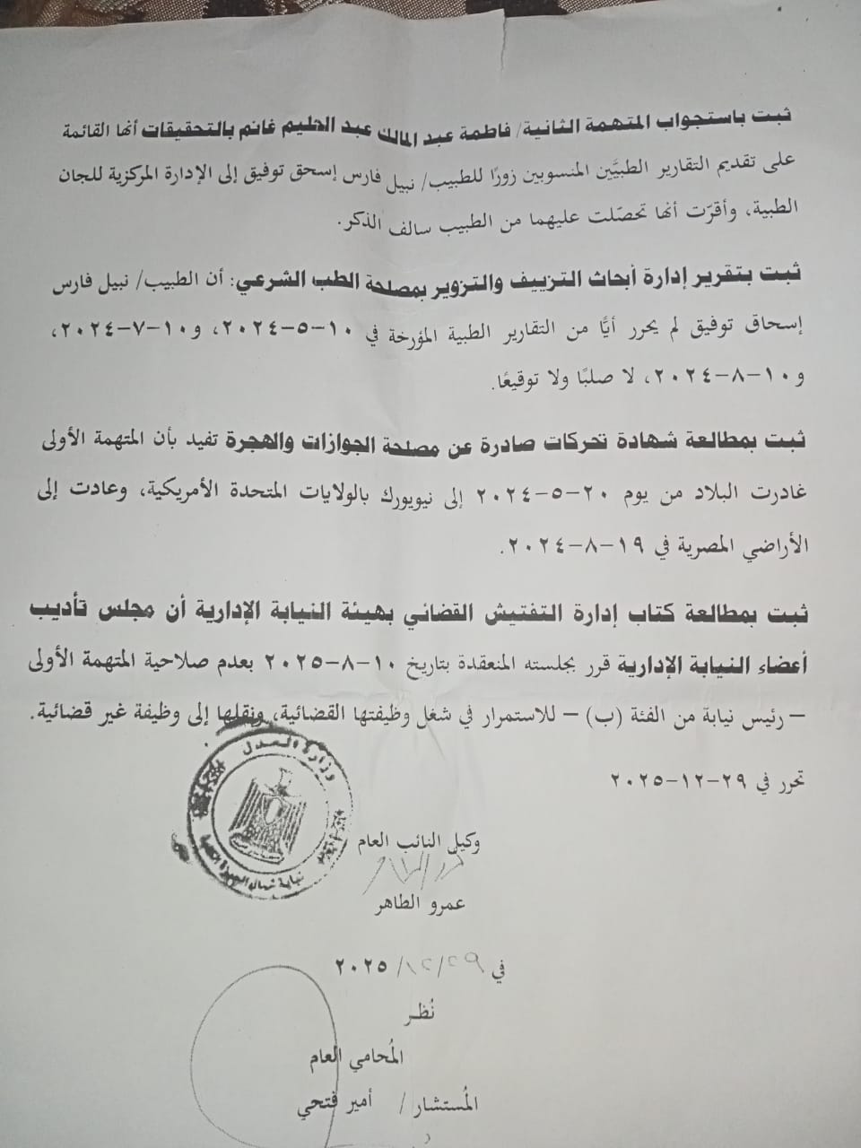 انفراد بالمستندات: عزل ومحاكمة رئيسة نيابة إدارية بتهمة تزوير تقارير طبية للحصول على إجازات