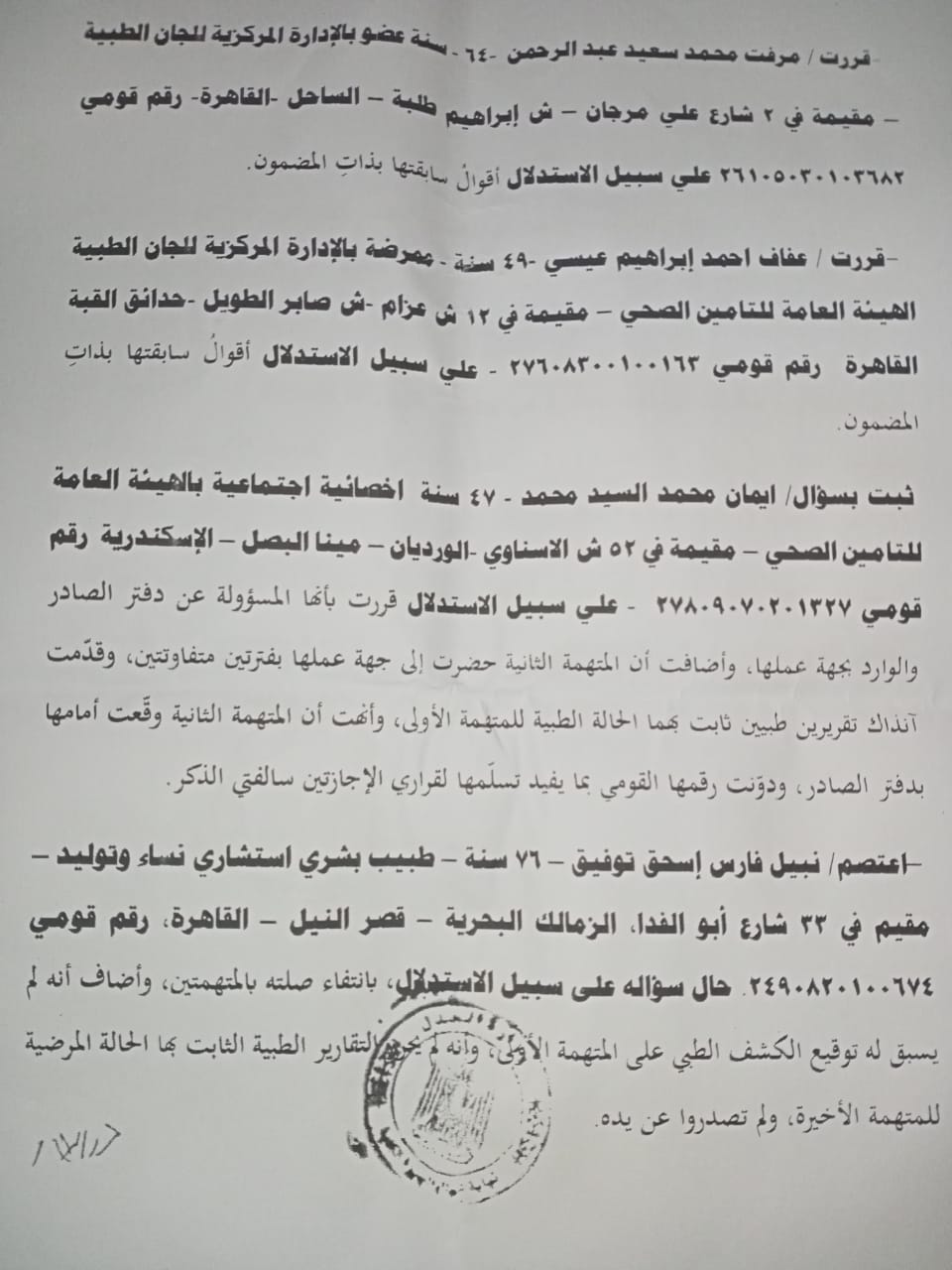 من بين الشهادات المهمة في القضية، جاءت أقوال الدكتورة نهاد محسن عبد اللطيف يوسف، وهي طبيبة عضو بالإدارة المركزية للجان الطبية.