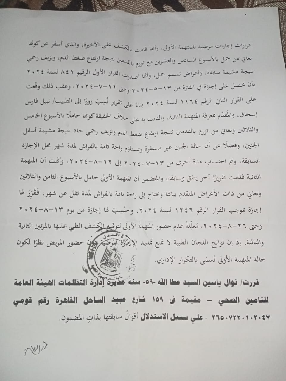 وبعد ذلك قدمت المتهمة الثانية تقريرا ثالثا يتضمن أن المتهمة الأولى حامل في الأسبوع الثامن والثلاثين وتعاني من ذات الأعراض، الأمر الذي أدى إلى إصدار قرار الإجازة المرضية رقم 1246 لسنة 2024.