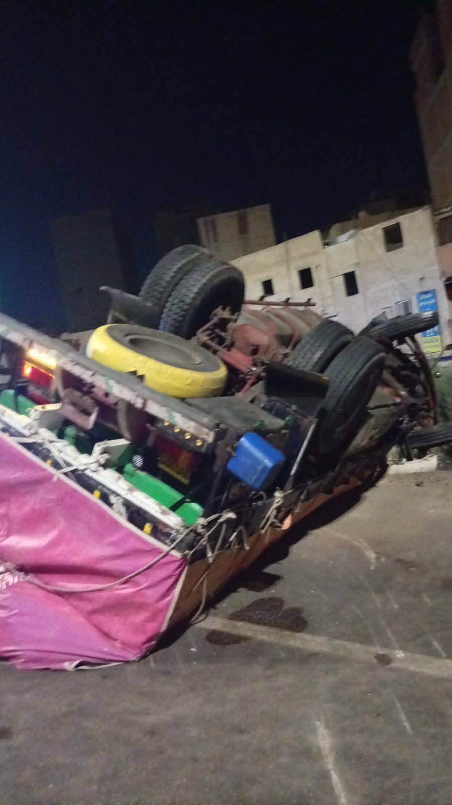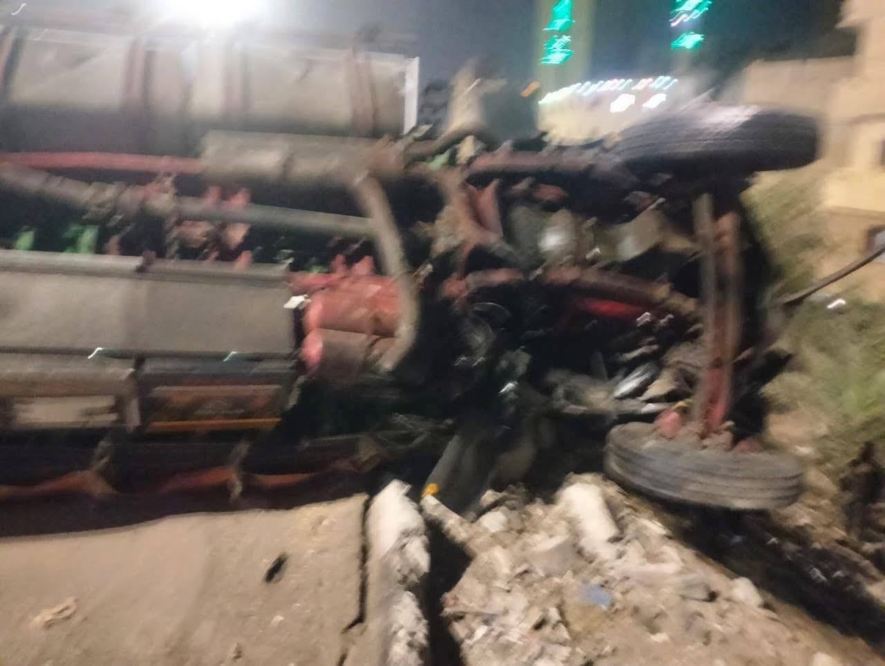 المعاينة الأولية والفحص أكد وقوع تصادم بين سيارتي نقل ثقيل وآخرى ملاكي، مما أدى إلى اختلال عجلة القيادة في يد السائقين، تسبب في انقلاب سيارتي النقل بحمولتهما على نهر الطريق.