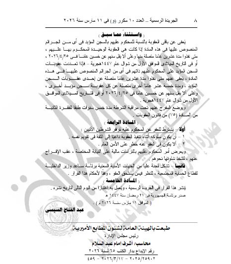 -المحكوم عليهم بالسجن المؤبد إذا كانوا قد نفذوا 15 سنة ميلادية حتى أول شوال 1447 هـ مع وضع المفرج عنه تحت مراقبة الشرطة لمدة 5 سنوات.