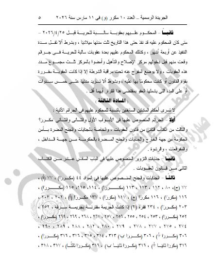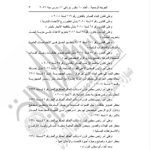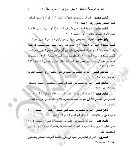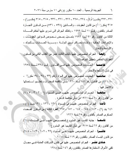 وصدر القرار بعد الاطلاع على الدستور وعدد من القوانين المنظمة، من بينها قانون العقوبات، وقانون الإجراءات الجنائية، وقوانين مكافحة الإرهاب والمخدرات وغسل الأموال، وغيرها من التشريعات ذات الصلة، ونشر القرار رقم 142 لسنة 2026 في الجريدة الرسمية بعددها رقم 10 مكرر (و) الصادر بتاريخ 11 مارس 2026.
