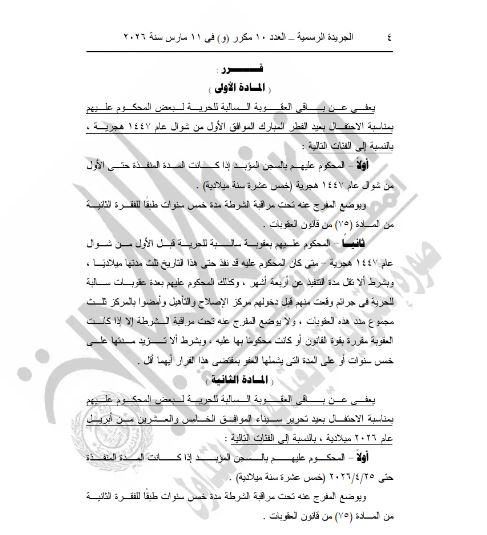 -الإفراج عن المحكوم عليهم بالسجن المؤبد إذا كانوا قد نفذوا 15 سنة حتى 25 أبريل 2026 مع خضوعهم لمراقبة الشرطة لمدة 5 سنوات.