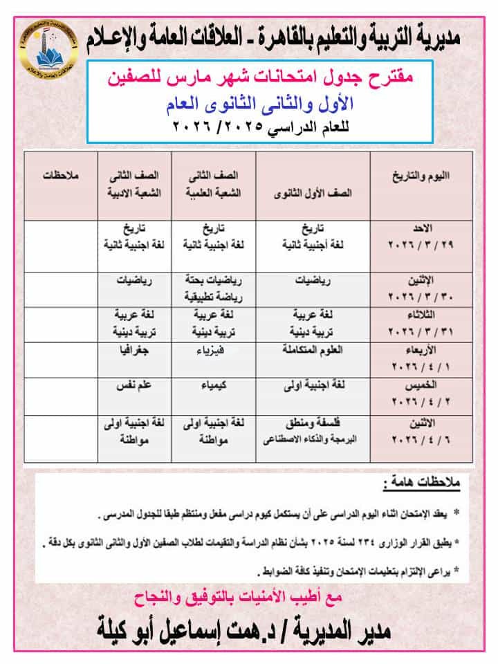 وأشارت وكيل وزارة التربية والتعليم بالقاهرة إلى أن مقترح جداول امتحانات شهر مارس لمراحل النقل الثلاثة (ابتدائي ـ إعدادى ـ ثانوى) للعام الدراسي ٢٠٢٦/٢٠٢٥، كشف أنها تعقد فى الفترة من يوم السبت الموافق ٢٠٢٦/٣/٢٨ حتي يوم الاثنين الموافق ٢٠٢٦/٤/٦.