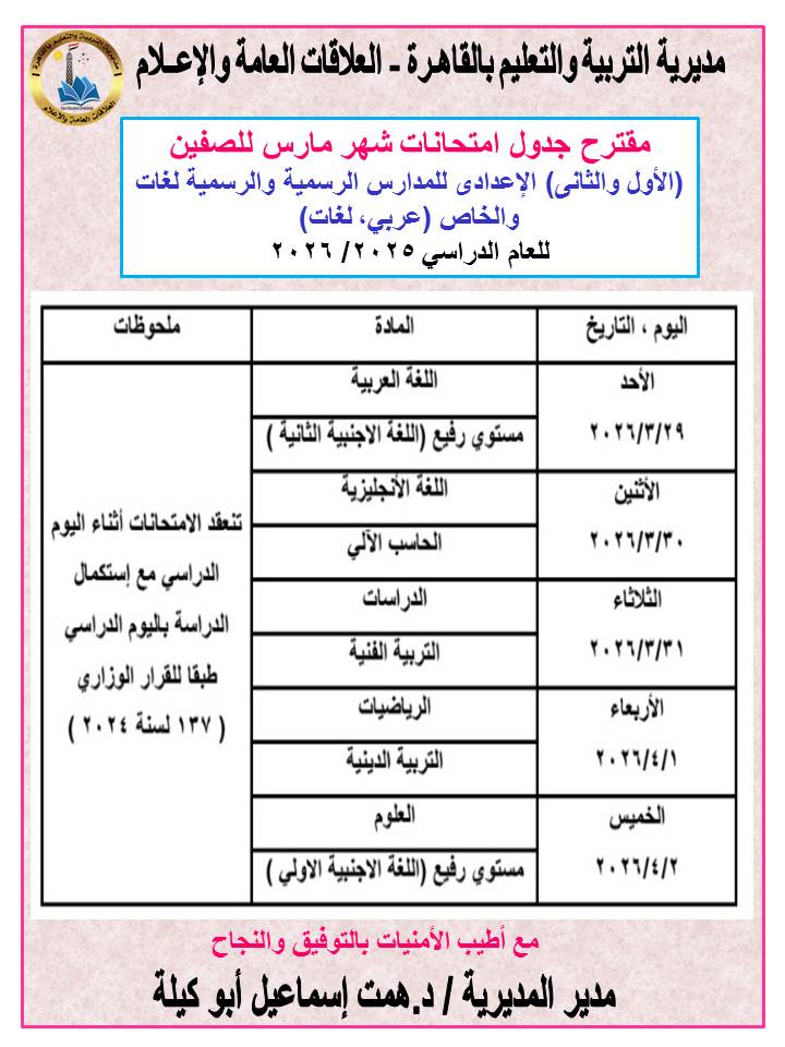 أعلنت مديرية التربية والتعليم والتعليم الفني بمحافظة القاهرة، مقترح جداول امتحانات شهر مارس لمراحل النقل الثلاثة للعام الدراسي ٢٠٢٦/٢٠٢٥.
