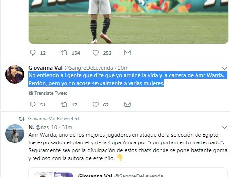 قالت الفتاة المكسيكية جيوفانا فال، التى نشرت الفيديو المخل الذى تسبب في استبعاد اللاعب عمرو وردة من المنتخب، "لا أفهم الأشخاص الذين يقولون إنني دمرت حياة عمرو وردة، عذرا، لكنني لا أتحرش بالعديد من النساء"!