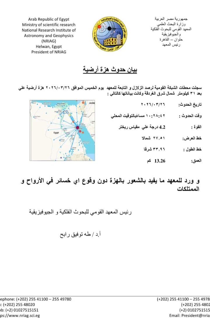 أوضح مركز عمليات محافظة البحر الأحمر أن الهزة الارضية التي شعر بها أهالى مدينة الغردقة لم تنجم عنها أي خسائر فى الأرواح أو الممتلكات العامة أو الخاصة وأن وقتها قليل حدا لمدة لحظات بسيطة.