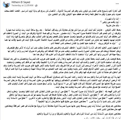وأوضح ولي الأمر، خلال منشور على صفحته بموقع التواصل الاجتماعي «فيس بوك» أنه بعد انقطاع الاتصال، تواصل مجددًا مع ابنته ليكتشف أن المتحدثة كانت مديرة المدرسة، والتي لاحظت ارتداء الطالبة لونًا مخالفًا للزي المدرسي.