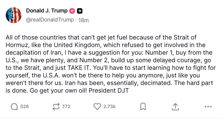 وقال ترامب في منشور عبر منصته "تروث سوشيال" إن بريطانيا من بين الدول التي لم تعد قادرة على الحصول على وقود الطائرات بسبب إغلاق مضيق هرمز، مشيرا إلى أنها رفضت المشاركة في "عملية قطع رأس النظام الإيراني".