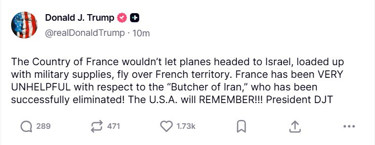 وفي منشور منفصل، هاجم الرئيس الأمريكي فرنسا، متهما إياها بعدم التعاون الكافي، مشيرا إلى أنها منعت الطائرات المحملة بالإمدادات العسكرية المتجهة إلى إسرائيل من التحليق فوق أراضيها.
