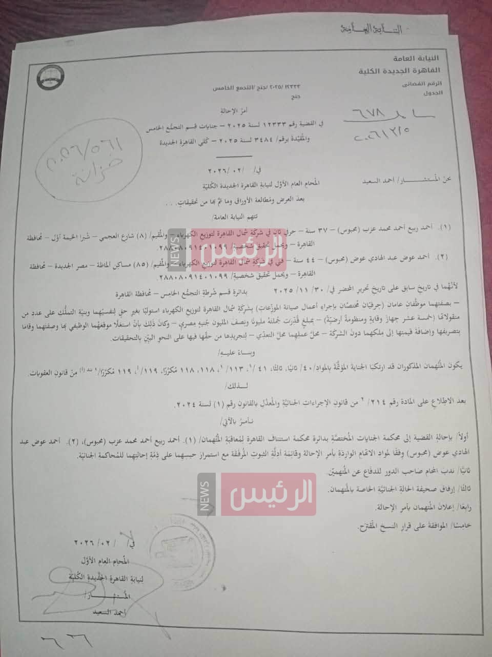 صدر القرار برئاسة المستشار أحمد السعيد، المحامي العام الأول لنيابة القاهرة الجديدة الكلية، في القضية رقم 12333 لسنة 2025 جنايات قسم التجمع الخامس، والمقيدة برقم 3484 لسنة 2025 كلي القاهرة الجديدة، حيث وجهت النيابة اتهاماتها إلى كل من أحمد ر. م. (37 عامًا – محبوس)، حرفي بشركة شمال القاهرة لتوزيع الكهرباء، وأحمد ع. ع. (44 عامًا – محبوس)، فني بالشركة ذاتها.