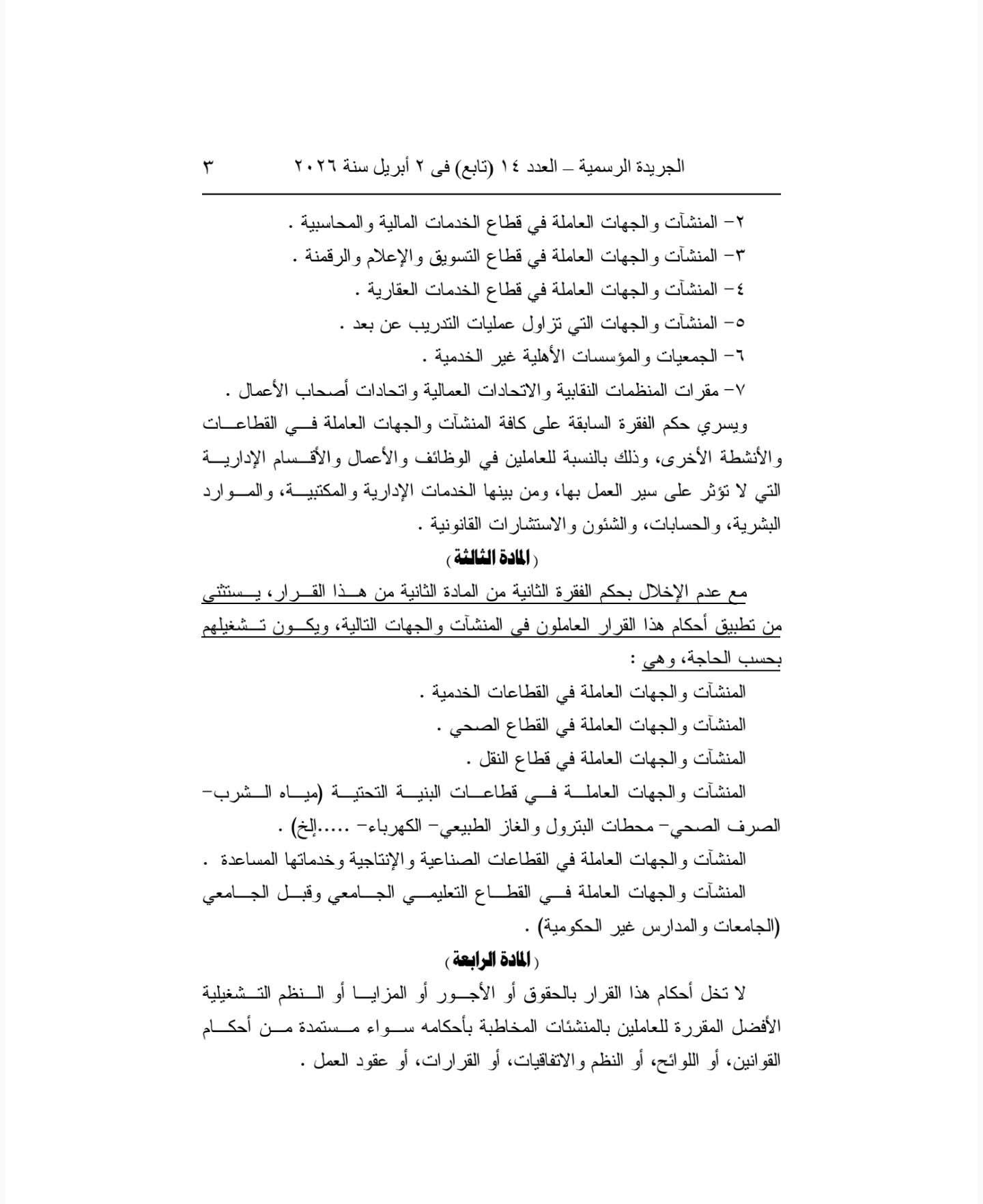 وأكدت الحكومة حرصها على استثناء عدد من القطاعات الحيوية من تطبيق هذا النظام، في مقدمتها المصانع، والمستشفيات، ومحطات المياه والغاز والصرف الصحي، وكافة الخدمات الأساسية التي لا يمكن تشغيلها عن بُعد، وذلك لضمان عدم تأثر الخدمات المقدمة للمواطنين واستمرارها بكفاءة، كما تم استثناء المدارس والجامعات من تطبيق منظومة العمل عن بُعد، تجنبًا لأي تأثير سلبي على العملية التعليمية، خاصة مع اقتراب نهاية العام الدراسي، حيث يمثل انتظام الدراسة أولوية لا تقل أهمية عن باقي الملفات الحيوية.