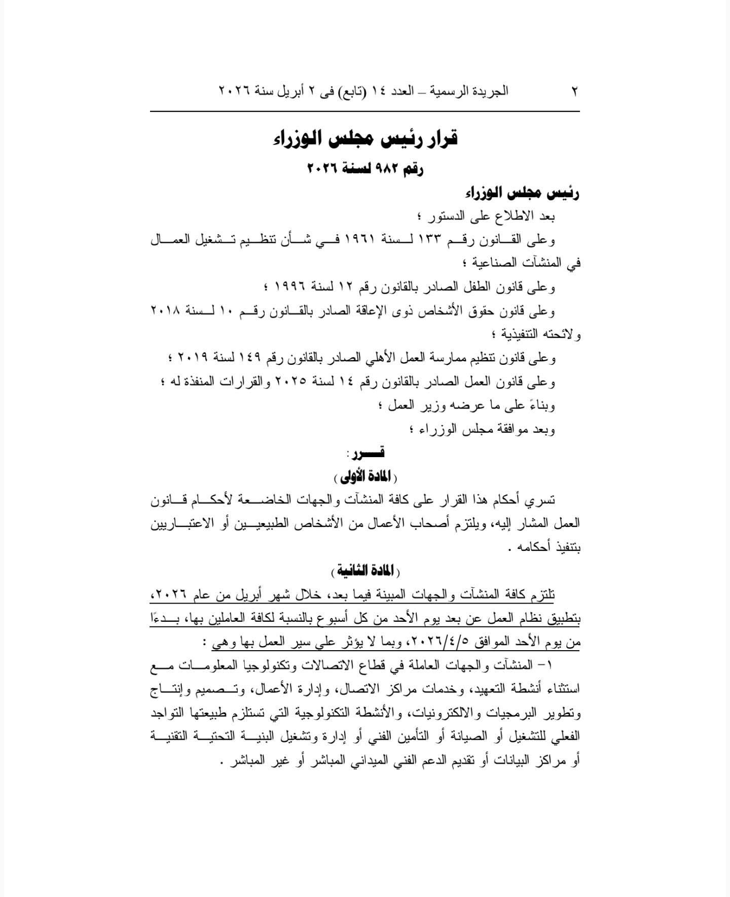 أعلنت الحكومة بدء تفعيل منظومة العمل عن بُعد اعتبارًا من، غد الأحد، ليوم واحد من كل أسبوع، في إطار حزمة متكاملة من الإجراءات التي تستهدف ترشيد استهلاك الوقود والطاقة، دون التأثير على معدلات الإنتاج والتشغيل، ومن المقرر تطبيق هذا النظام على القطاعين الحكومي والخاص لمدة شهر مبدئيًا، مع استثناء القطاعات الإنتاجية والخدمية الحيوية.