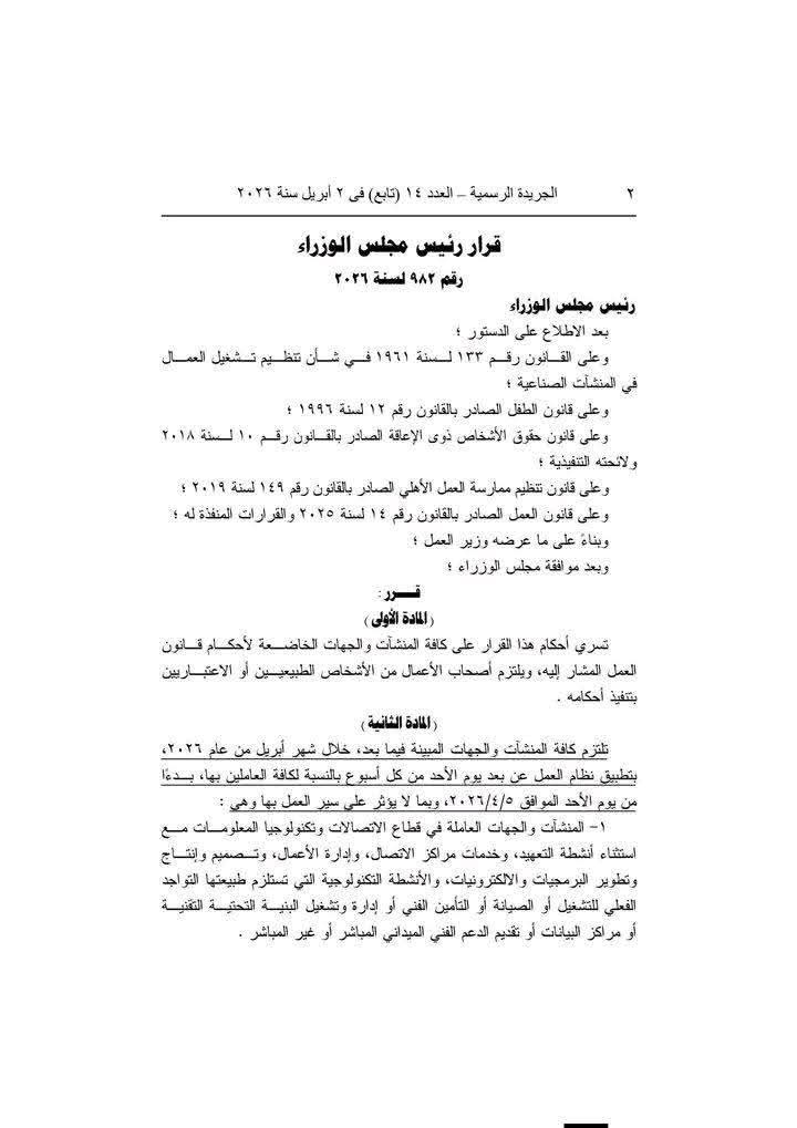 أعلن وزير العمل حسن رداد، اليوم الأحد، صدور كتاب دوري بشأن متابعة تطبيق نظام العمل عن بُعد في منشآت القطاع الخاص، تنفيذًا لقرار رئيس مجلس الوزراء رقم 982 لسنة 2026، الخاص بتنظيم العمل عن بُعد يوم الأحد من كل أسبوع، وذلك خلال شهر أبريل الجاري، دون التأثير على سير العمل داخل المنشآت.