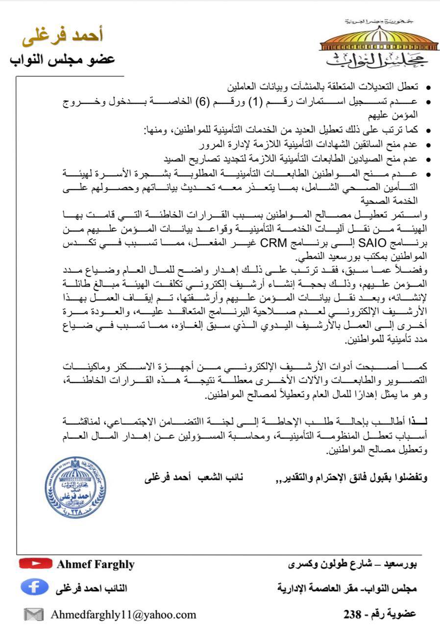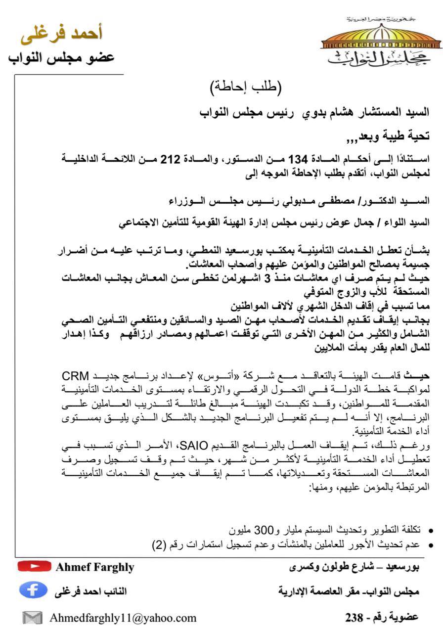تقدم النائب أحمد فرغلى، عضو مجلس النواب، بطلب إحاطة إلى المستشار هشام بدوي رئيس مجلس النواب موجه إلى الدكتور مصطفى مدبولي رئيس مجلس الوزراء، اللواء جمال عوض رئيس مجلس إدارة الهيئة القومية للتأمين الاجتماعي، بشأن تعطل الخدمات التأمينية بمكتب بورسعيد النموذجي، وما ترتب عليه من أضرار جسيمة بمصالح المواطنين والمؤمن عليهم وأصحاب المعاشات.