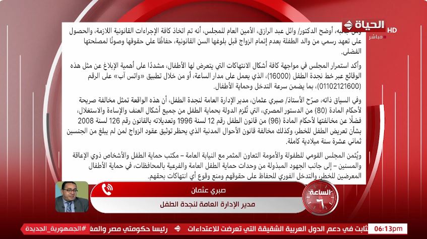 أكد صبري عثمان، مدير الإدارة العامة لنجدة الطفل، نجاح المجلس القومي للطفولة والأمومة في إحباط محاولة زواج طفلة تبلغ من العمر 13 عامًا بمحافظة أسيوط، وذلك بعد تلقي بلاغ عاجل من والدتها حول الواقعة، موضحًا أن سرعة التحرك من الجهات المعنية كانت حاسمة في منع تنفيذ الزواج وحماية حقوق الطفلة القانونية.
