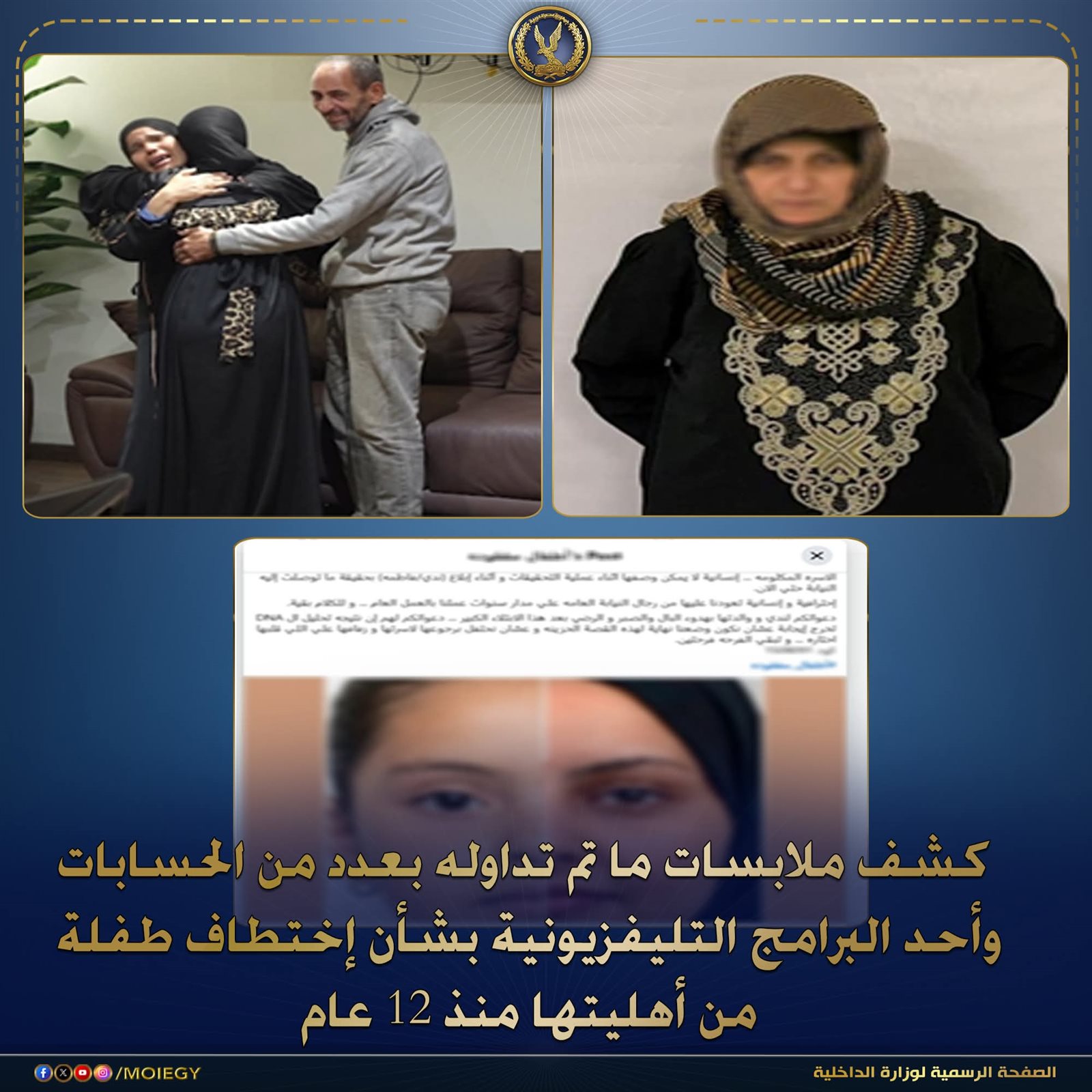 فى إطار كشف ملابسات ما تم تداوله بعدد من الحسابات بمواقع التواصل الإجتماعى وأحد البرامج التليفزيونية بشأن إختطاف طفلة من أهليتها منذ 12 عام.