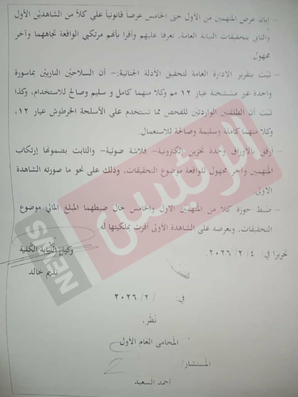 وبناءً على ما سبق من أدلة وشهادات واعترافات، قررت النيابة العامة إحالة المتهمين جميعًا إلى المحاكمة الجنائية، لاتهامهم بارتكاب جريمة سرقة بالإكراه، وحيازة أسلحة نارية وبيضاء دون ترخيص.