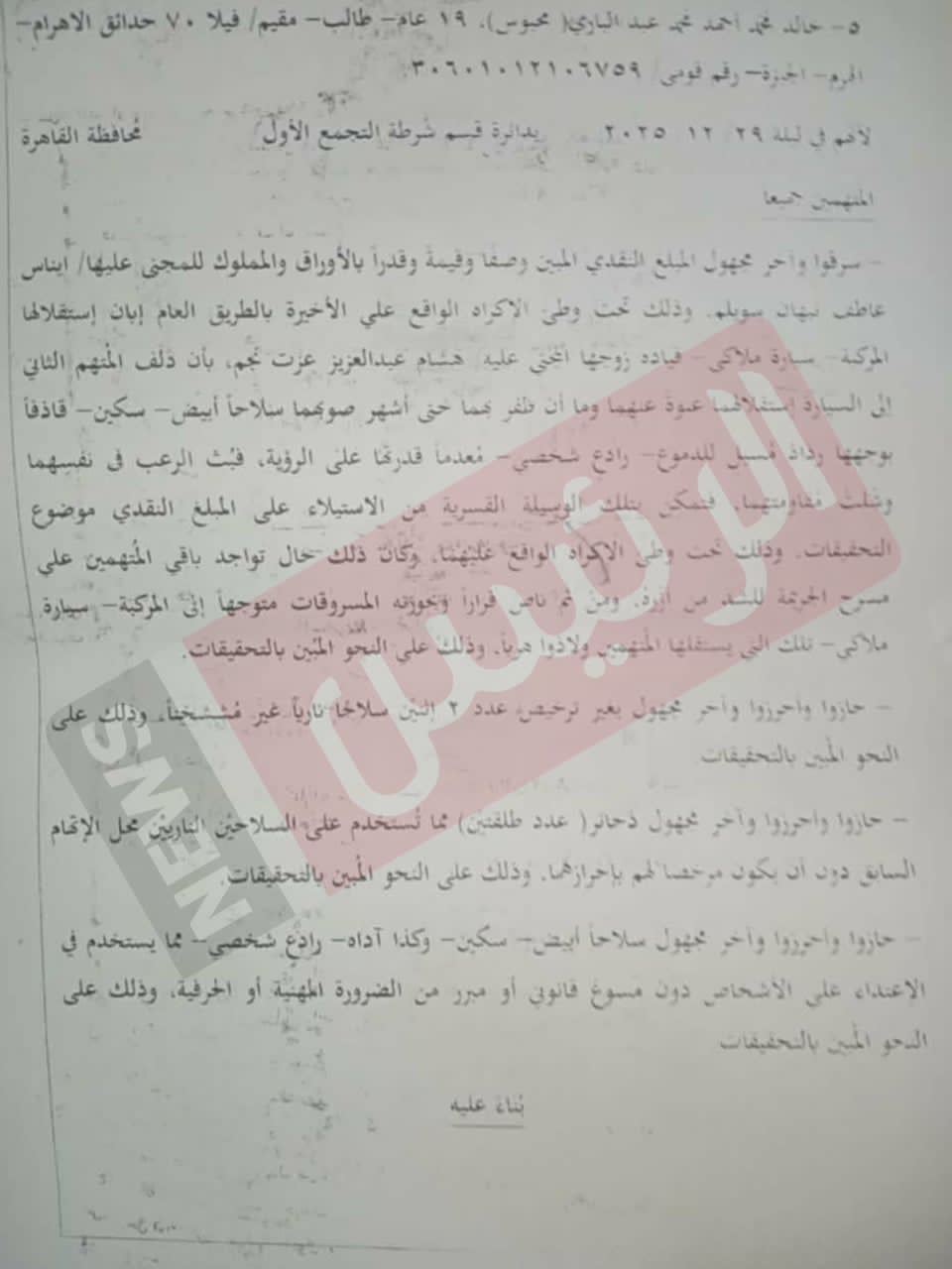 حصل "الرئيس نيوز" على نص تحقيقات النيابة العامة في القضية رقم 25073 لسنة 2025 جنايات التجمع الأول، والتي تتعلق بقيام تشكيل عصابي مكون من خمسة متهمين وآخر مجهول، بتنفيذ جريمة سرقة بالإكراه استهدفت مديرًا عامًا بأحد البنوك وزوجته، والاستيلاء على مبلغ مالي كبير بالعملة الأجنبية من داخل سيارتهما، مستخدمين أسلحة بيضاء ونارية ومواد مُعطِّلة للحركة.