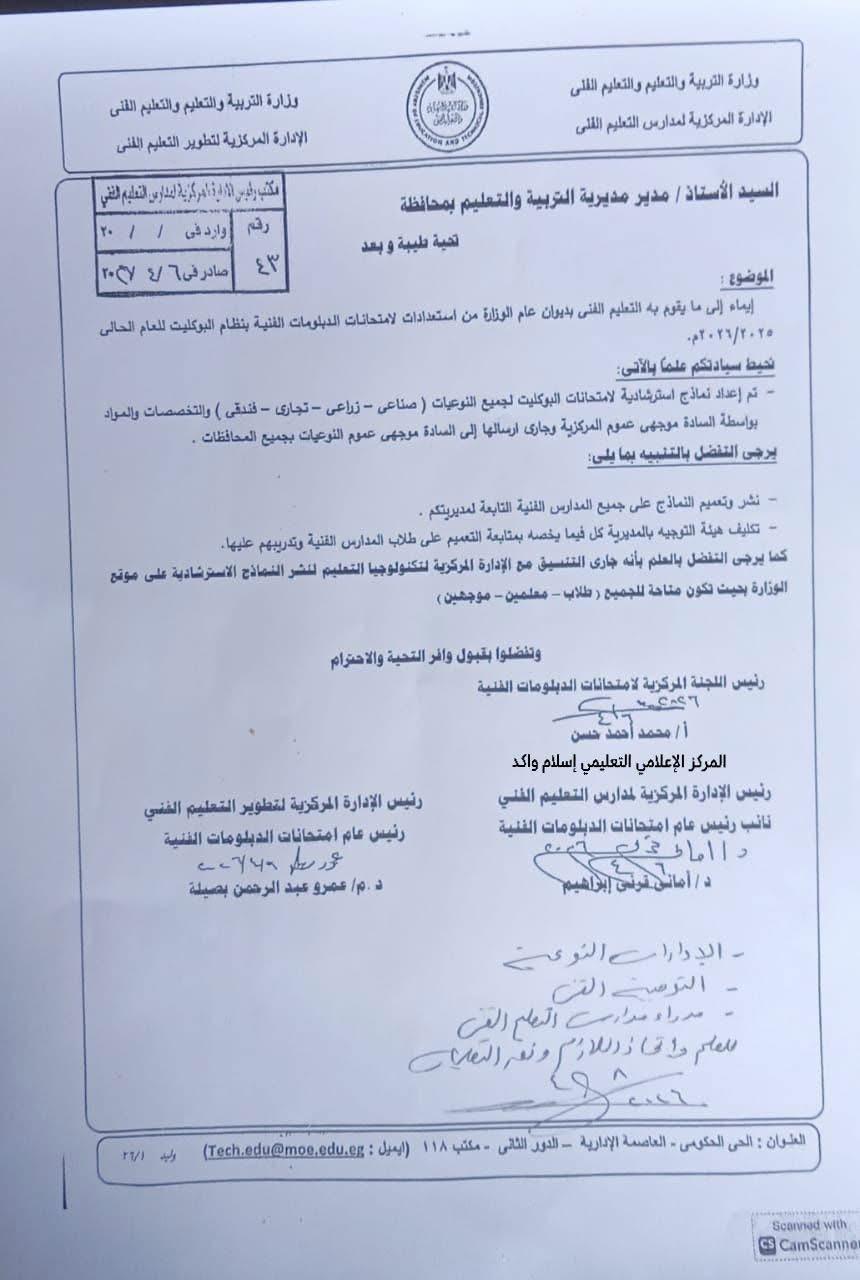 وأرسلت وزارة التربية والتعليم والتعليم الفنى خطابا إلى المديريات التعليمية، موضحة أنه إيماء إلى ما يقوم به التعليم الفنى بديوان عام الوزارة من استعدادات لامتحانات الدبلومات الفنية بنظام البوكليت للعام الحالى، تم إعداد نماذج استرشادية لامتحانات البوكليت لجميع النوعيات ( صناعی - زراعی - تجاری - فندقى ) والتخصصات والمواد بواسطة موجهى عموم المركزية وتم إرسالها إلى موجهى عموم النوعيات بجميع المحافظات.