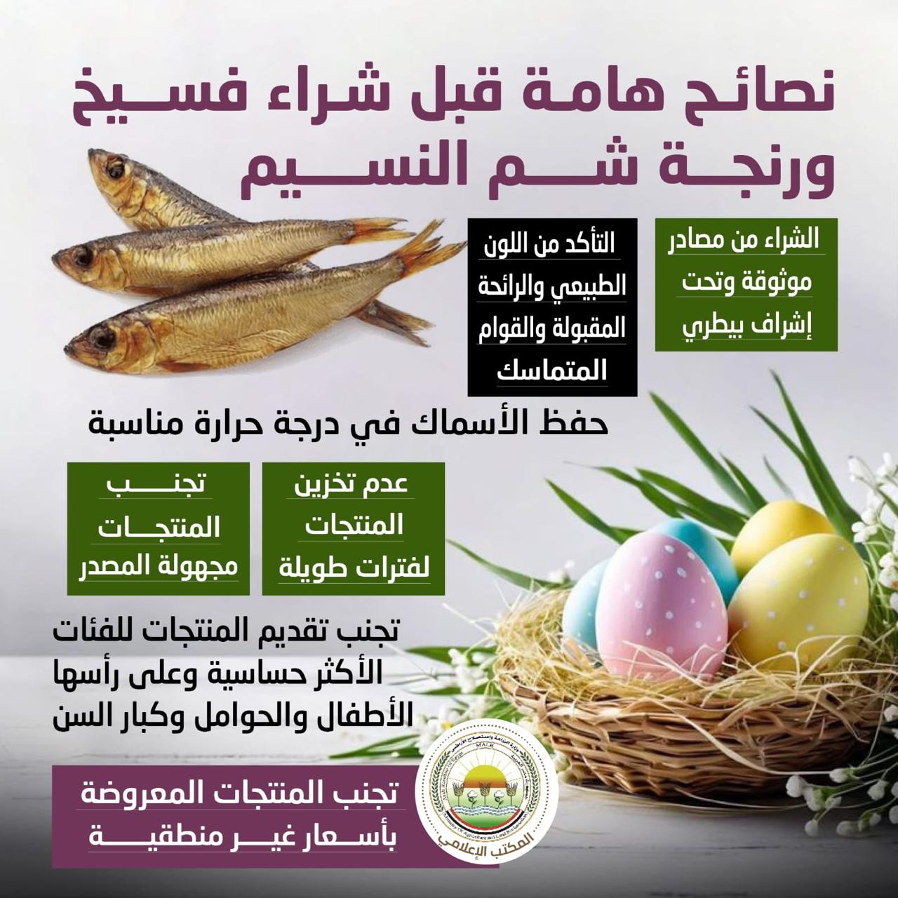 ونشرت وزارة الزراعة، حزمة الإرشادات الوقائية، للمواطنين، في مقدمتها شراء الأسماك المملحة من مصادر موثوقة وتحت إشراف بيطري، والتأكد من سلامة المنتج من حيث اللون والرائحة والقوام، مع تجنب المنتجات مجهولة المصدر أو المعروضة بأسعار غير منطقية.