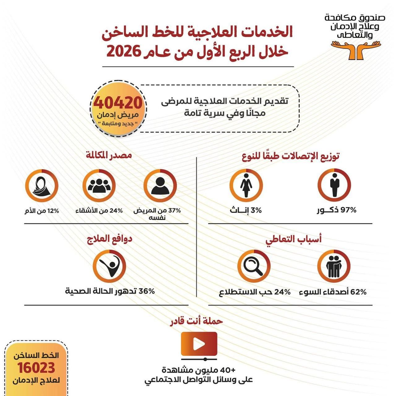 نشر صندوق مكافحة وعلاج الإدمان والتعاطي إنفوجرافا على الصفحة الرسمية للصندوق " الفيس بوك "عن مجهودات الخط الساخن للصندوق "16023"، خلال الربع الأول من عام 2026، حيث تم تقديم الخدمات العلاجية لعدد 40420 مريض "جديد ومتابعة"، كما يتم توفير الخدمات العلاجية لأى مريض إدمان من أبناء المناطق المطورة "بديلة العشوائيات" "الأسمرات، المحروسة، روضة السودان، روضة السيدة، أهالينا، الخيالة، بشاير الخير، حدائق أكتوبر".