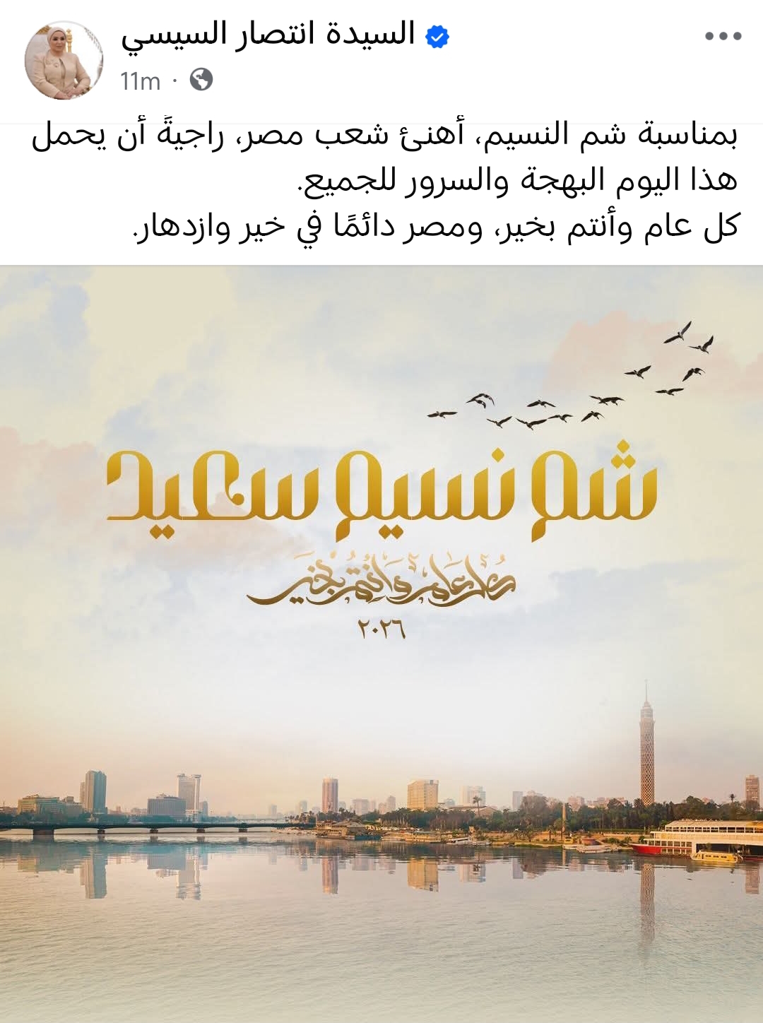 وقالت السيدة انتصار السيسي، في تدوينة عبر حسابها الرسمي على موقع التواصل الاجتماعي "فيسبوك": "بمناسبة شم النسيم، أهنئ شعب مصر، راجيةً أن يحمل هذا اليوم البهجة والسرور للجميع.. كل عام وأنتم بخير، ومصر دائمًا في خير وازدهار".