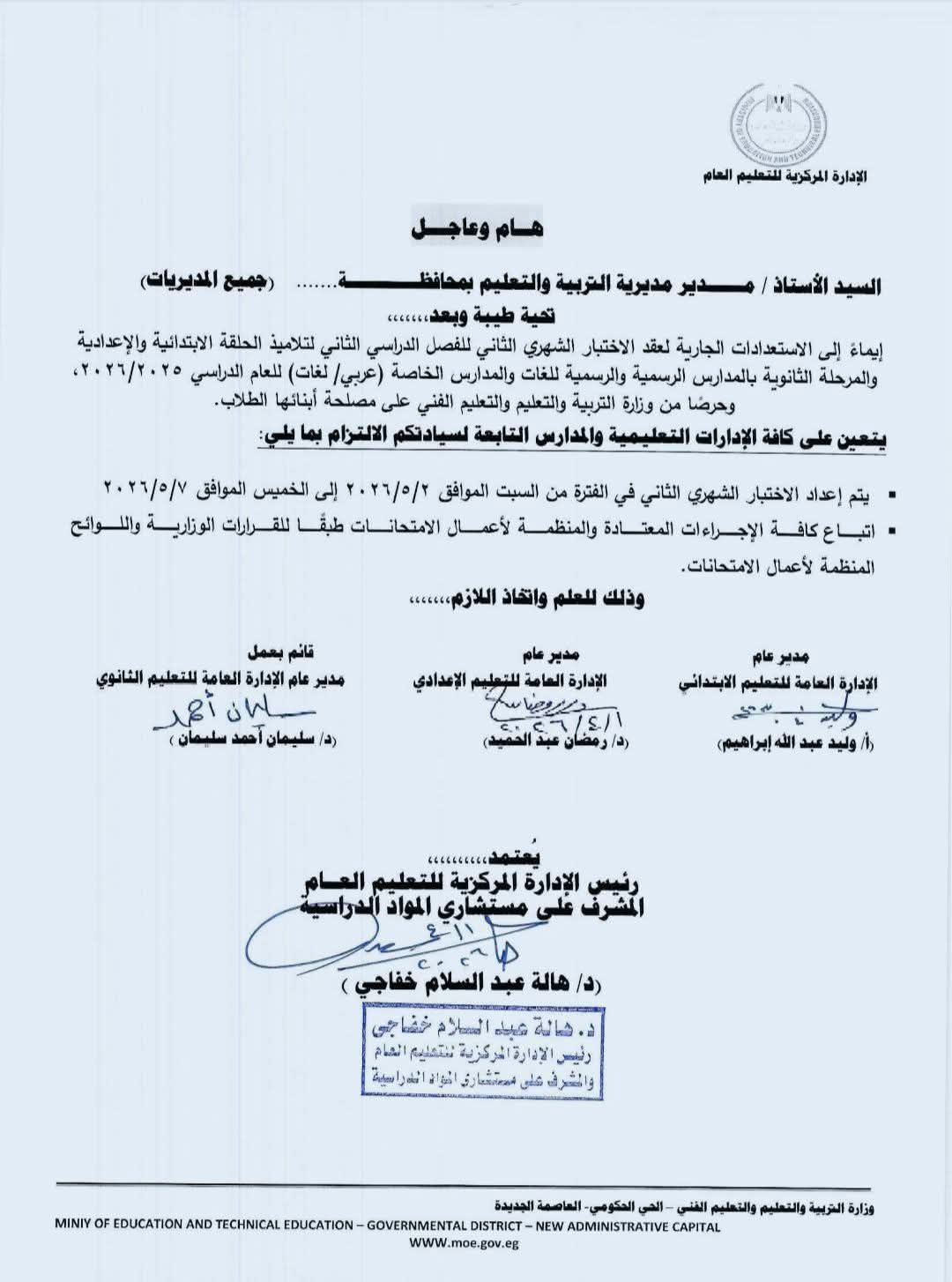 أوضحت وزارة التربية والتعليم والتعليم الفني، أنه إيماء إلى الاستعدادات الجارية لعقد الاختبار الشهري الثاني للفصل الدراسي الثاني لتلاميذ الحلقة الابتدائية والإعدادية والمرحلة الثانوية بالمدارس الرسمية والرسمية للغات والمدارس الخاصة ( عربي ) لغات) للعام الدراسي ٢٠٢٦/٢٠٢٥ وحرصًا من وزارة التربية والتعليم والتعليم الفني على مصلحة  الطلاب، يتم إعلان جداول امتحانات شهر إبريل لطلاب صفوف النقل.