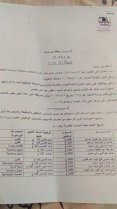 "بني سويف": إعادة تعيين 86 من العاملين الحاصلين على مؤهل أعلى