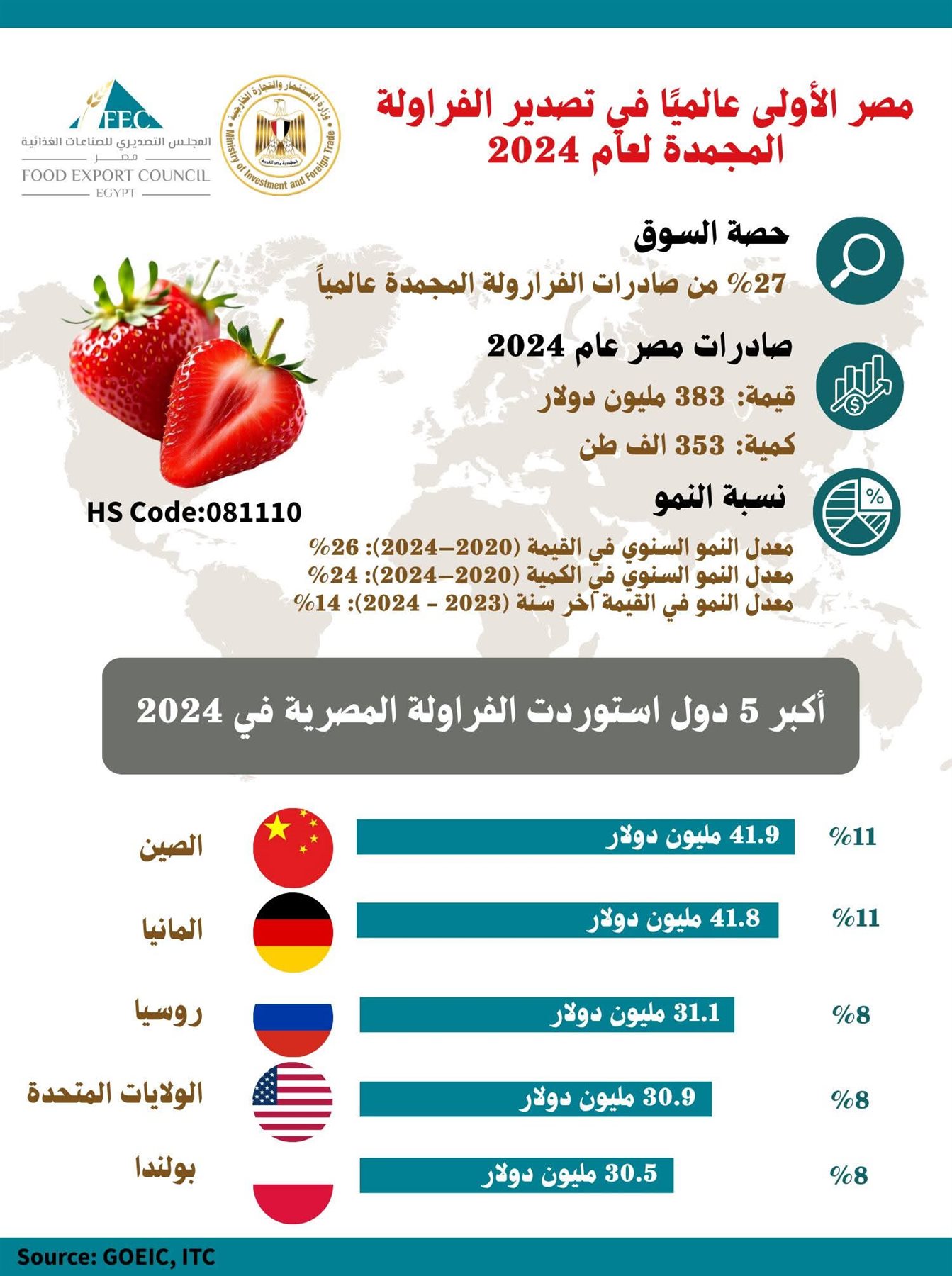 كما حافظت مصر على المركز الأول عالميًا في تصدير الفراولة المجمدة خلال عام 2024، مستحوذة على 27% من الحصة السوقية العالمية، بإجمالي صادرات بلغ 383 مليون دولار، وبكمية تجاوزت 353 ألف طن، كما بلغت خلال الشهرين السابقين 100 مليون دولار.