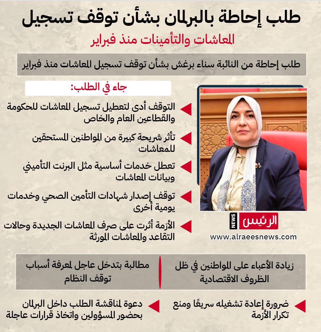وأوضحت النائبة أن هذا التوقف أدى إلى تعطيل تسجيل المعاشات بمختلف أنواعها، سواء للعاملين في الحكومة أو القطاعين العام والخاص، الأمر الذي تسبب في تأخير مصالح شريحة واسعة من المواطنين المستحقين للمعاشات، وإلى الإنفوجراف..