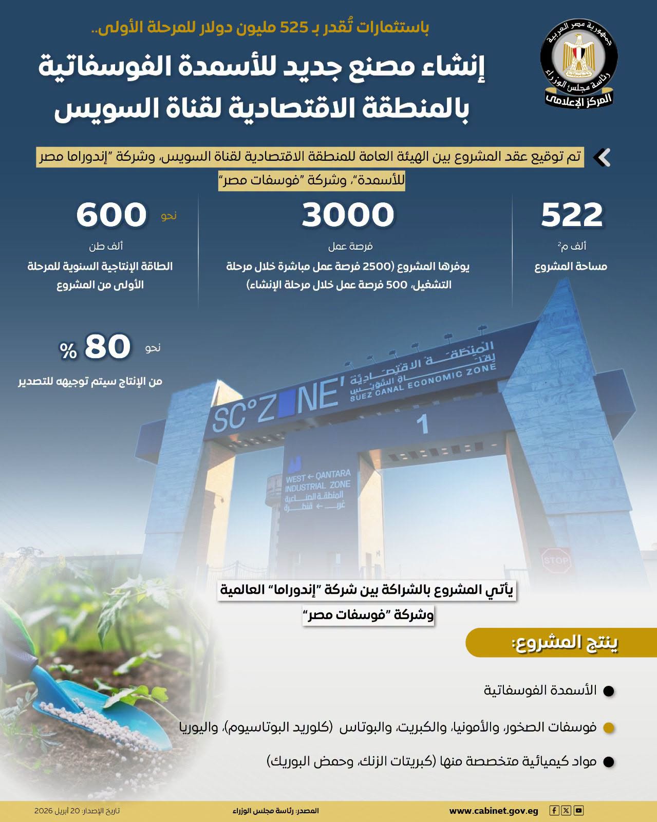 استعرض مجلس الوزراء المصري مشروع شركة إندوراما مصر للأسمدة بمنطقة السخنة الصناعية، باعتباره إضافة مهمة لقطاع الصناعات الكيماوية المرتبطة بالثروات التعدينية.