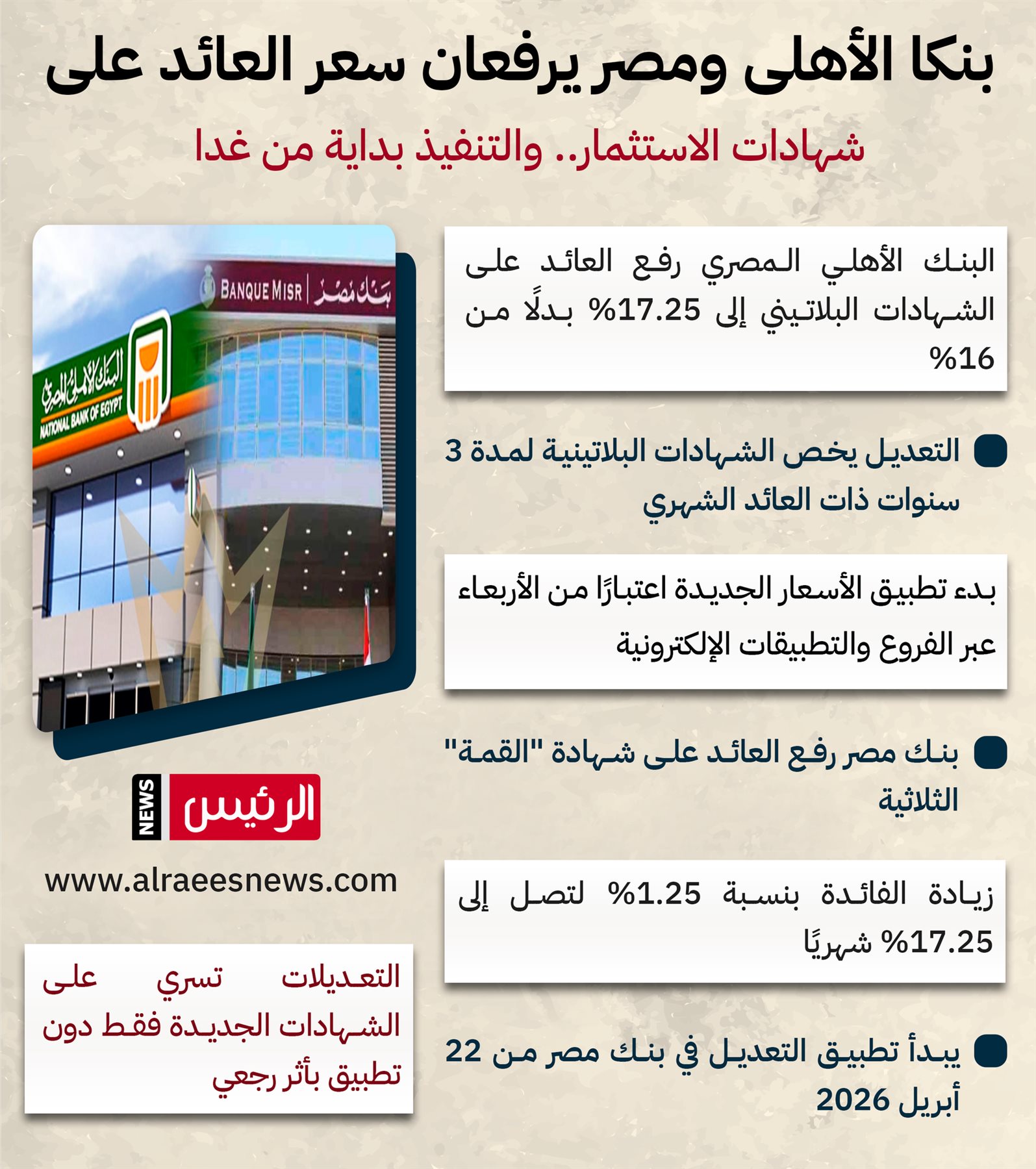بنكا الأهلى ومصر يرفعان سعر العائد على شهادات الاستثمار| إنفوجراف