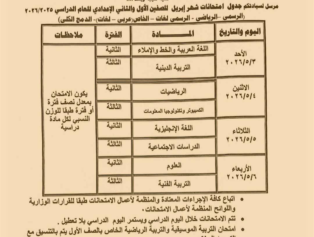 جداول امتحانات شهر إبريل 2026 لصفوف النقل بعد تعديلها بمطروح
