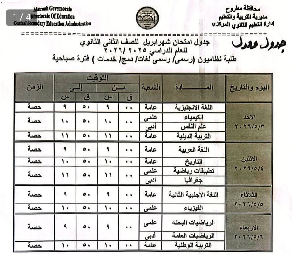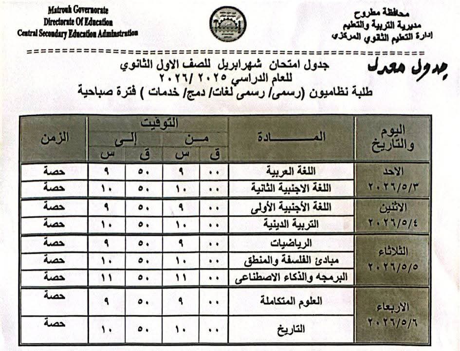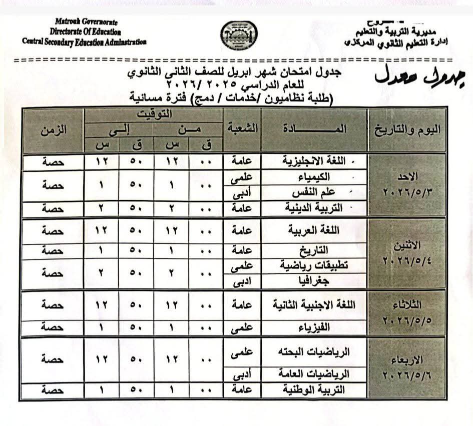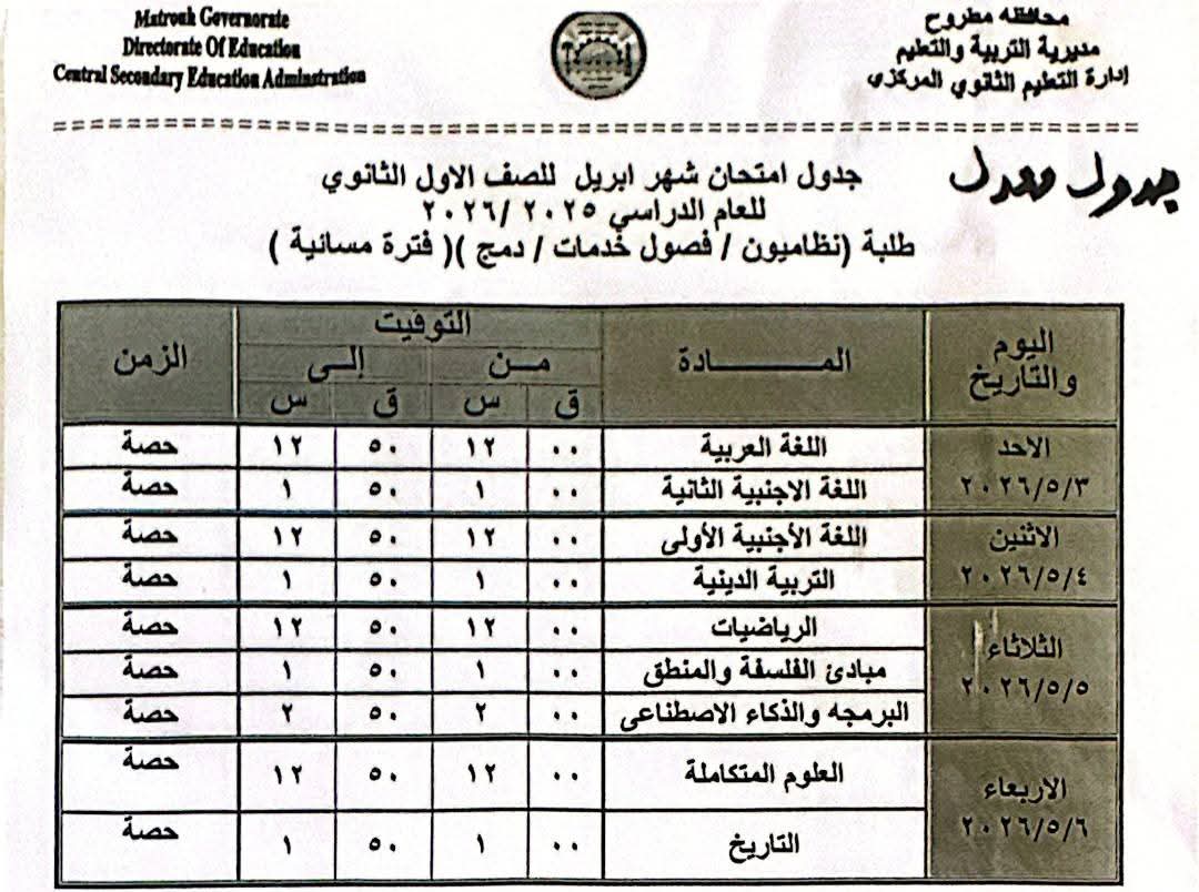 أعلنت مديرية التربية والتعليم والتعليم الفني بمحافظة مطروح، جداول امتحانات شهر إبريل 2026 لصفوف النقل بعد تعديلها بسبب إجازة عيد العمال المقرر لها يوم 7 مايو المقبل.