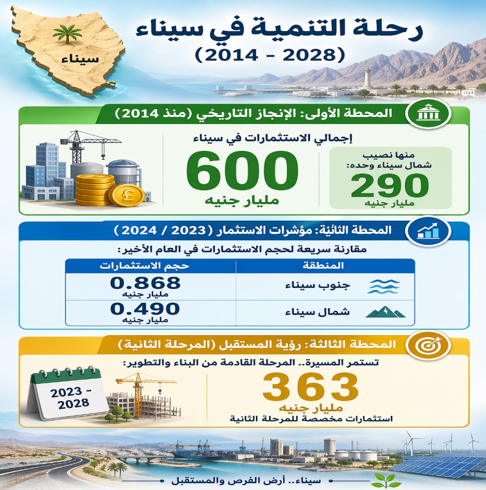 وفي ضوء خطة 2025/2026، تستهدف الدولة استثمارات جديدة بقيمة 6.6 مليار جنيه لشمال سيناء و3.6 مليار جنيه لجنوبها، موزعة على قطاعات الزراعة والصحة والنقل والمياه والتعليم، إلى جانب التوسع في مشروعات الري والتحلية والخدمات. كما يجري إنشاء مركز خدمات مصر بالعريش لتقديم أكثر من 156 خدمة حكومية في موقع واحد، بما يعكس التحول نحو نموذج إداري رقمي متكامل يرفع كفاءة الخدمات ويعزز ثقة المواطنين.