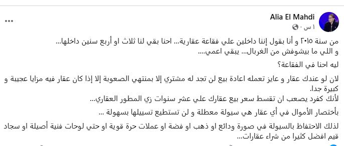 وتابعت: «باختصار الأموال في أي عقار هي سيولة معطلة ولن تستطيع تسييلها بسهولة.. لذلك الاحتفاظ بالسيولة في صورة ودائع أو ذهب أو فضة أو عملات حرة قوية، أو حتى لوحات فنية أصيلة أو سجاد قيم أفضل كثيرا من شراء عقارات.