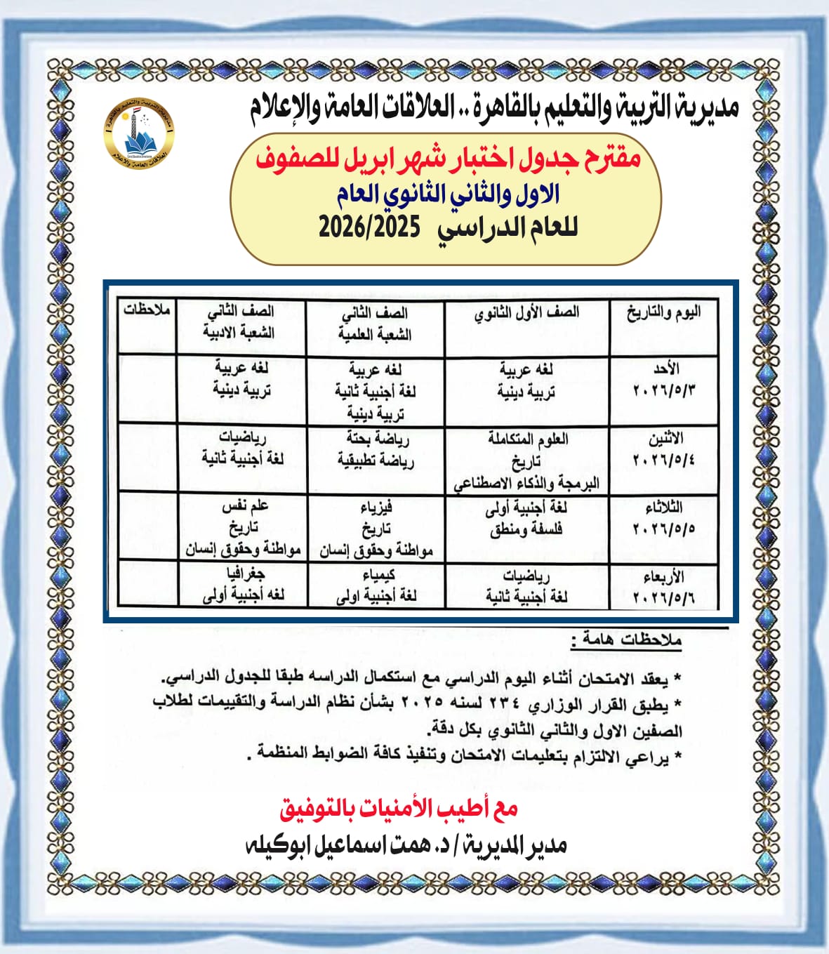 وأشارت المديرية التعليمية بالقاهرة، إلل أن امتحانات شهر إبريل ستعقد خلال الفترة من يوم السبت الموافق ٢٠٢٦/٥/٢ حتى يوم الأربعاء الموافق ٢٠٢٦/٥/٦