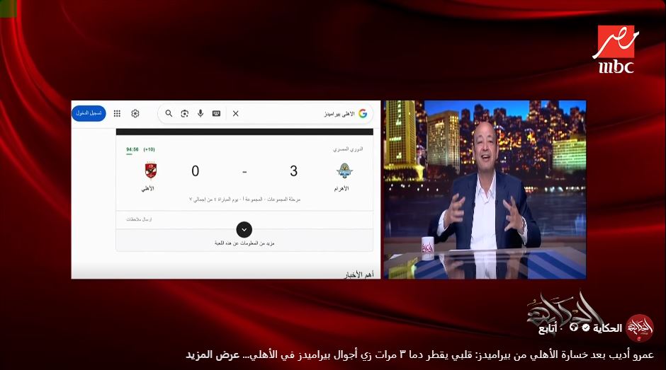 عمرو أديب ساخرًا من هزيمة الأهلي أمام بيراميدز: «قلبي يقطر دمًا»|فيديو
