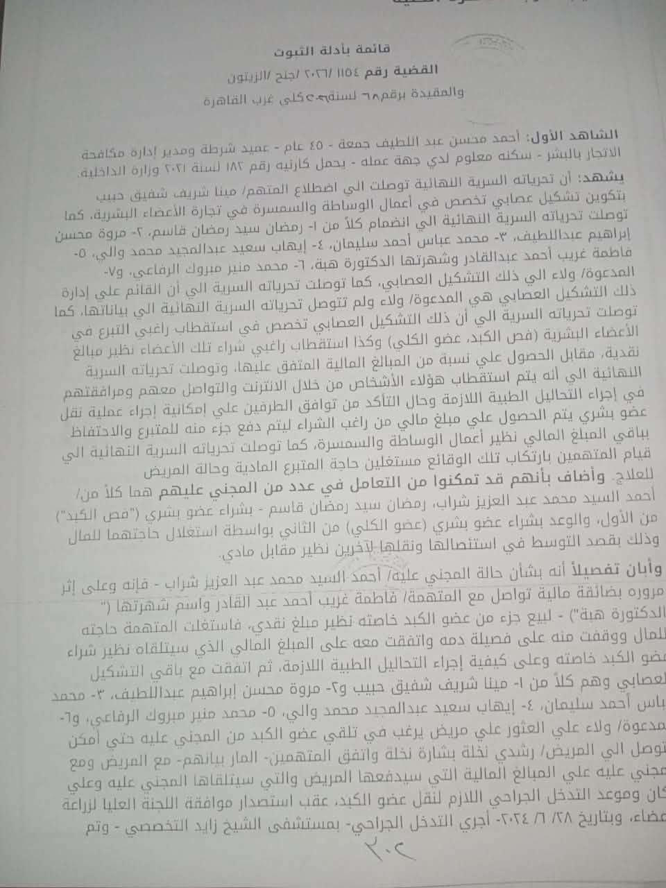 سردت التحقيقات واقعة المجني عليه أحمد السيد محمد عبد العزيز شراب، الذي لجأ – وفق أقواله – إلى بيع جزء من كبده نتيجة ضائقة مالية، حيث تواصل مع "الدكتورة هبة"، التي استغلت حاجته، ونسّقت مع باقي المتهمين للعثور على مريض متلقٍ.