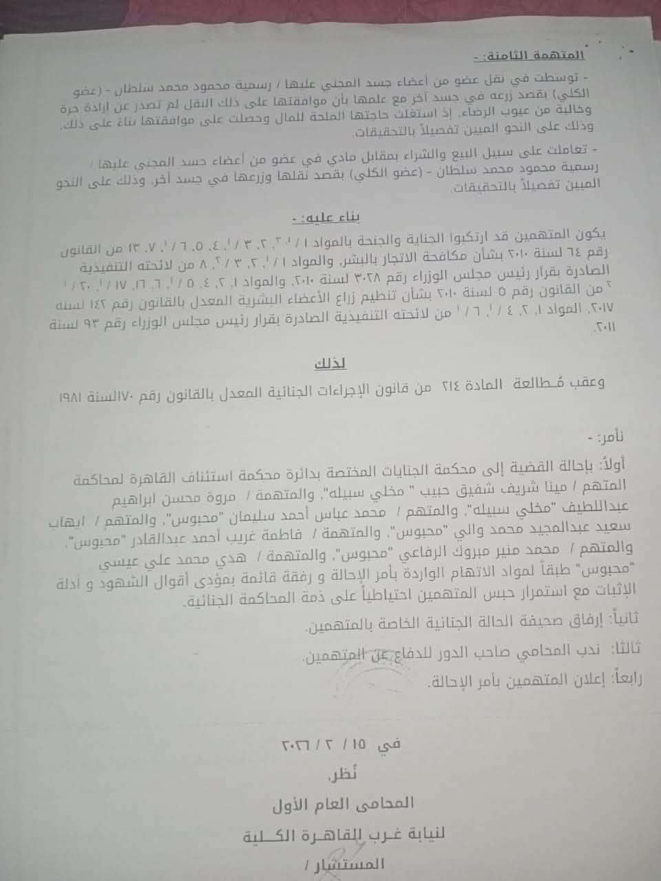 ومن المقرر أن تنظر المحكمة المختصة القضية خلال جلسات مقبلة، للفصل في الاتهامات المنسوبة إلى المتهمين، في ضوء ما تضمنته التحقيقات من أدلة تفصيلية وشهادات وتحريات رسمية تكشف واحدة من أخطر وقائع الاتجار بالأعضاء البشرية في القاهرة.