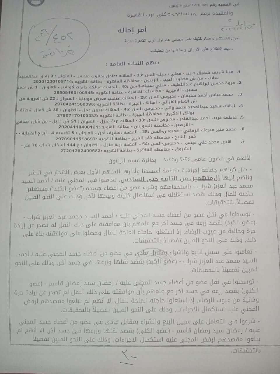 وبحسب أمر الإحالة، فإن المتهمين أسسوا خلال عامي 2024 و2025، بدائرة قسم الزيتون، جماعة إجرامية منظمة يتزعمها المتهم الأول، وتهدف إلى الاتجار في البشر عبر استقطاب أشخاص يمرون بضائقة مالية، وإقناعهم بالخضوع لعمليات نقل وزراعة أعضاء بشرية نظير مقابل مادي.