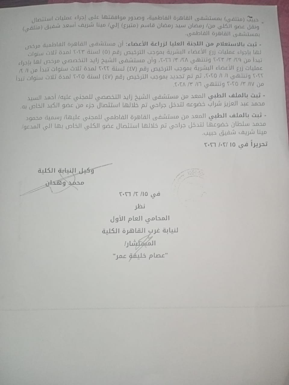 وفي 28 يونيو 2024، أُجريت العملية الجراحية، وتم استئصال جزء من كبد المجني عليه وزراعته للمريض، مقابل حصول الأول على مبلغ 100 ألف جنيه، فيما تقاضى المتهمون مبالغ مالية نظير أعمال الوساطة.