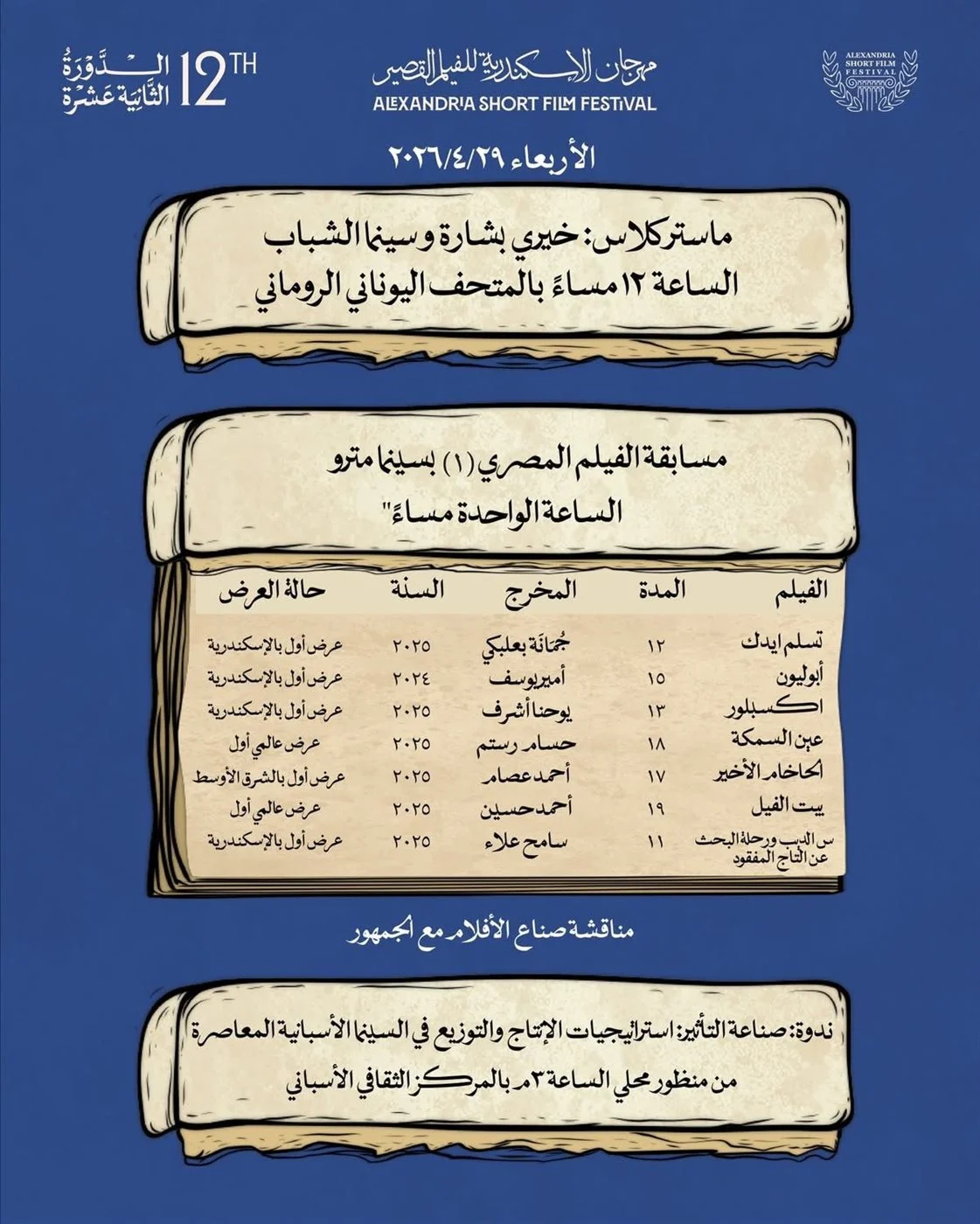 أقام مهرجان الإسكندرية للفيلم القصير اليوم  ماستر كلاس حول تجربة المخرج خيري بشارة وعلاقته بسينما الشباب، داخل المتحف اليوناني الروماني، ويديره المخرج عمر الزهيري.