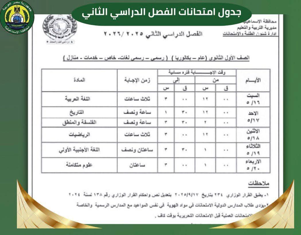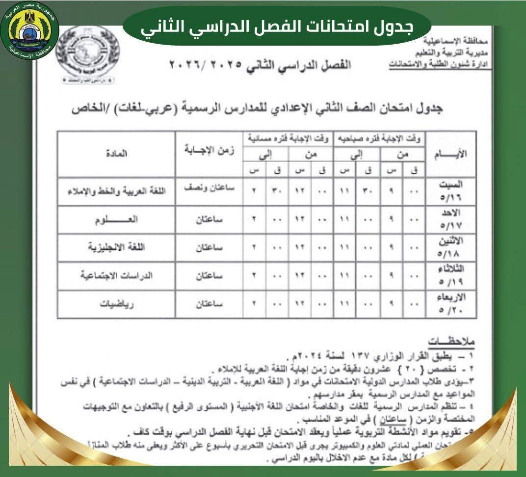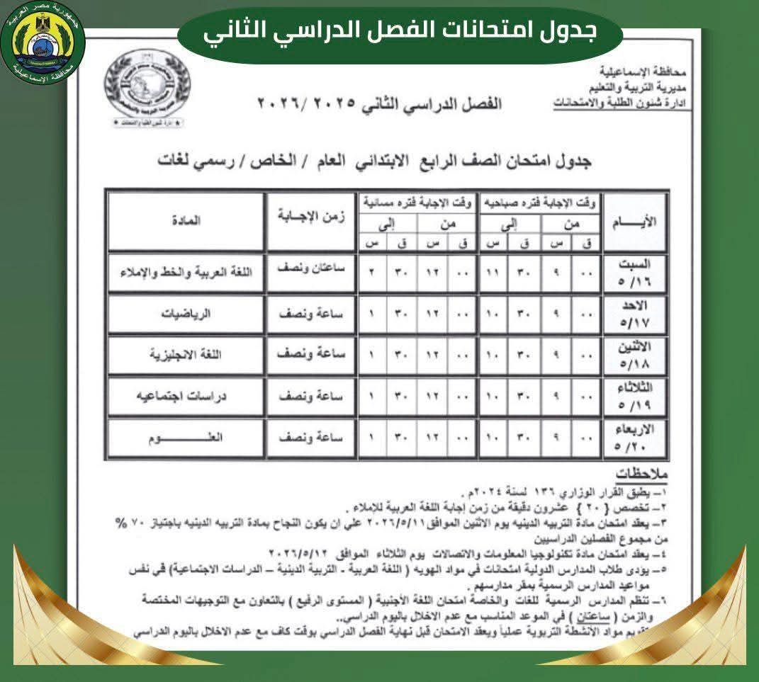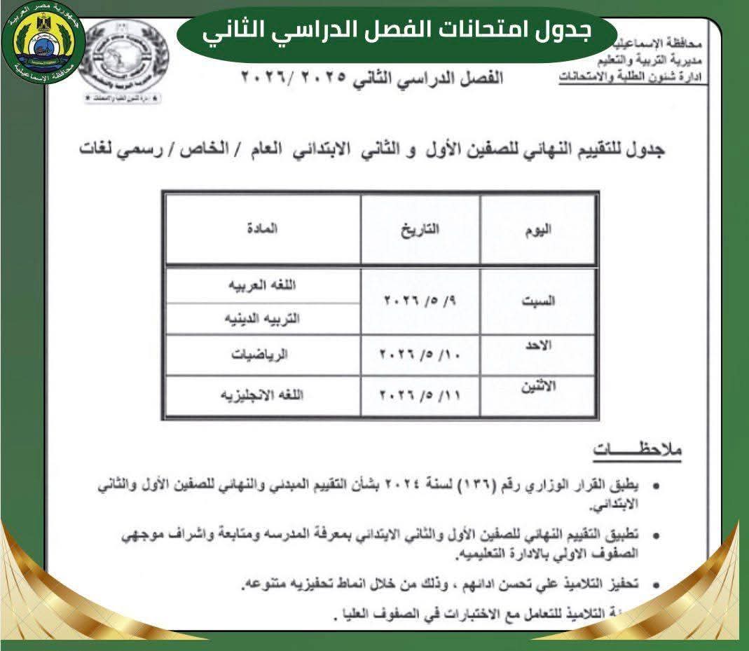 جداول امتحانات الترم الثاني 2026 جميع الصفوف محافظة الإسماعيلية