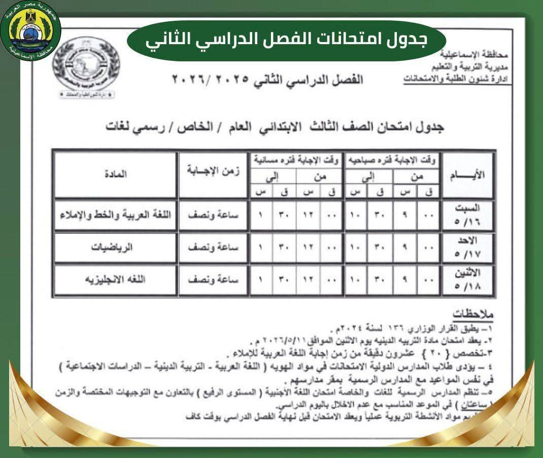 اعتمد اللواء نبيل حسب الله محافظ الإسماعيلية، جداول امتحانات الفصل الدراسي الثاني للعام الدراسي ٢٠٢٥ - ٢٠٢٦، لصفوف النقل والشهادات المحلية، حسب الخريطة الزمنية الواردة من وزارة التربية والتعليم والتعليم الفني للعام الدراسي ٢٠٢٥ - ٢٠٢٦.