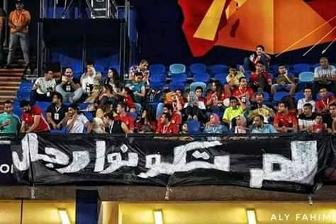 علق عدد من أفراد الجمهور الموجود في استاد القاهرة، لحضور مباراة نيجيريا وجنوب أفريقيا المقامة حاليا، لافتة كتبوا عليها "لم تكونوا رجال"، في إشارة إلى لاعبي المنتخب الوطني الذي خرج من البطولة، وتم إزالة اللافتة بعد دقائق قليلة من وضعها بمعرفة أمن الاستاد.