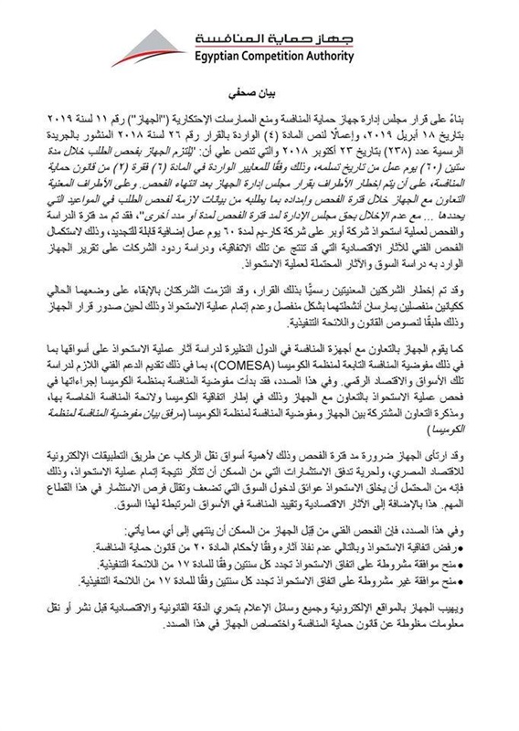 وقال الجهاز - في بيان له اليوم - إنه :"بناءً على قرار مجلس إدارة جهاز حماية المنافسة ومنع الممارسات الاحتكارية ("الجهاز") رقم 11 لسنة 2019 بتاريخ 18 أبريل 2019، وإعمالًا لنص المادة (4) الواردة بالقرار رقم 26 لسنة ٢٠١٨ المنشور بالجريدة الرسمية عدد (238) بتاريخ 23 أكتوبر 2018، فقد تم مد فترة الدراسة والفحص لعملية استحواذ شركة أوبر على شركة كار-يم لمدة 60 يوم عمل إضافية قابلة للتجديد".